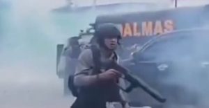 Situasi yang makin tidak terkendali membuat aparat kemanan menembakan gas airmata untuk membubarkan masa, dari pihak pendemo terlihat ada yang melempar petugas keamanan menggunakan batu.