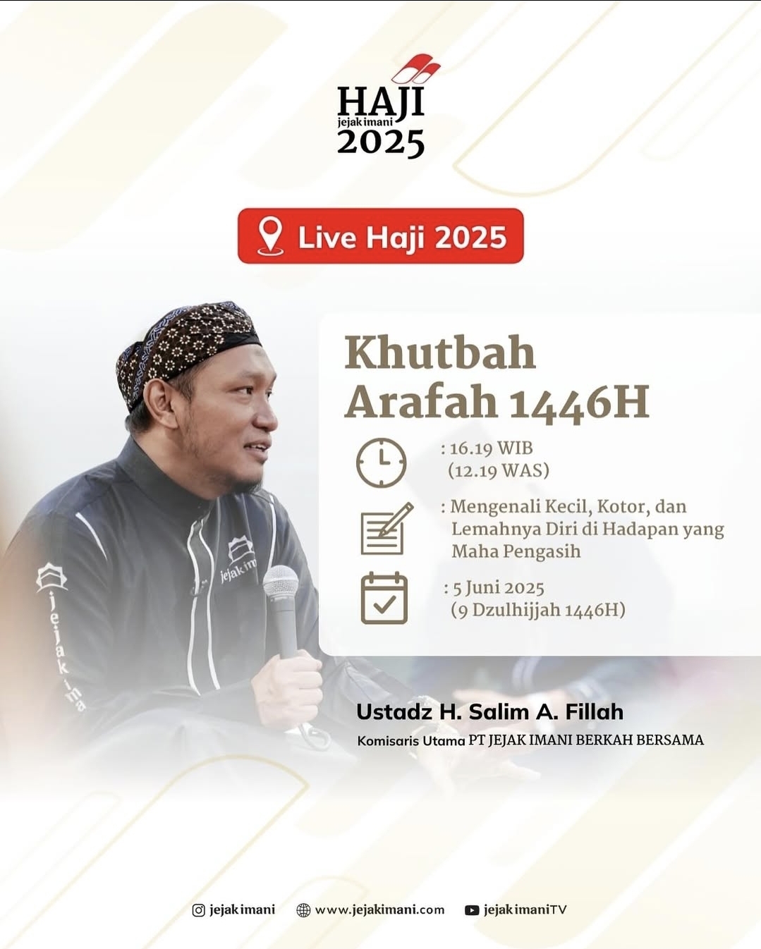By D.L.R • June 5, 2025 • Khutbah Arafah 1446 H: Salim A. Fillah Ajak Umat Renungi Keterbatasan Diri di Hadapan Allah ’Foto—Unggahan pemberitahuan Khutbah Arafah oleh Ustaz H. Salim A. Fillah. (Sumber: Instagram @jejakimani) Jakarta, Ekspresi...